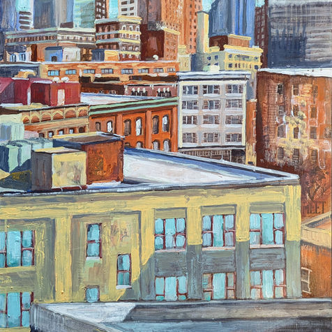 Matt’s cityscapes portray brick facades, deteriorating buildings, elaborate masonry and the imagined possibility of what may be part of the cityscape in our future. His current works focus on balance, philosophy and the passing of time, manifested in: the boarding up of windows, the texture of a forgotten billboard, the elegance and starkness of a momentary shadow and the rich colors of brick and stone. He also uses shadows to describe a particular moment, which emphasizes the impermanence of our views and his desire to preserve local historic architecture. The wears and tears of the buildings fabricate the passage of time and make our cities the unique environment that they are. However, some efforts to save these icons of the past are taken for granted and come to an end.